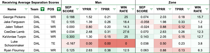 With KaVontae Turpin out, Ryan Flournoy should slide into more slot routes. Coming out of Southeast Missouri State, Flournoy was uber-productive, with a 42% Receiver Dominator and 2.86 Receiving Yards Per Team Pass Attempt throughout his college career. Don’t overreact to his three targets on eight routes against man coverage in 2025, or maybe he’s a sneaky player to watch. However, it should be the Pickens show again in Week 5 since Dak Prescott targeted him on the first-read 42.9% against the Packers.