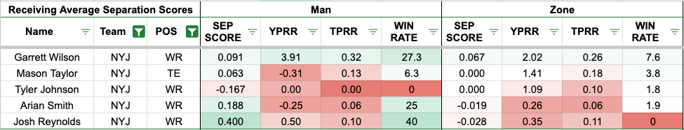 When the Jets’ quarterbacks see pressure, they look toward Wilson, garnering a 57.9% first-read target share. They air it out to Garrett Wilson. That’s evident by a 44.5% air yards share, leading a team-high 1.83 yards per route run when opposing defenses pressure the quarterback.