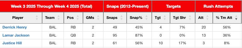 Henry’s 59% snap rate, 58% rush percentage, and 2% target share in Weeks 1-2 shifted to a 45% snap rate, 56% rush rate, and a 7% target share in Weeks 3-4. Justice Hill took a snap share lead (56%) with a whopping 17% target share in Weeks 3-4. The rushing efficiency will dip with Cooper Rush as the quarterback with Jackson injured, meaning Hill might serve as a checkdown option.