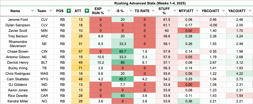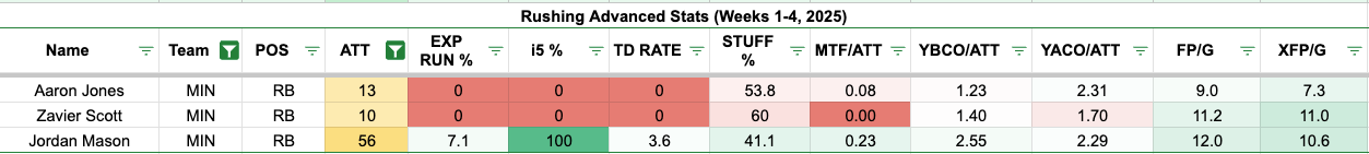 The Browns’ defensive line allows the lowest adjusted YBC/Att, while the Vikings’ offensive line generates the seventh-highest YBC/Att. That suggests it might be more of a strength-versus-strength type of matchup in Week 5. Jordan Mason boasts an above-average 2.55 YBC/Att, more than his YAC/Att (2.29).