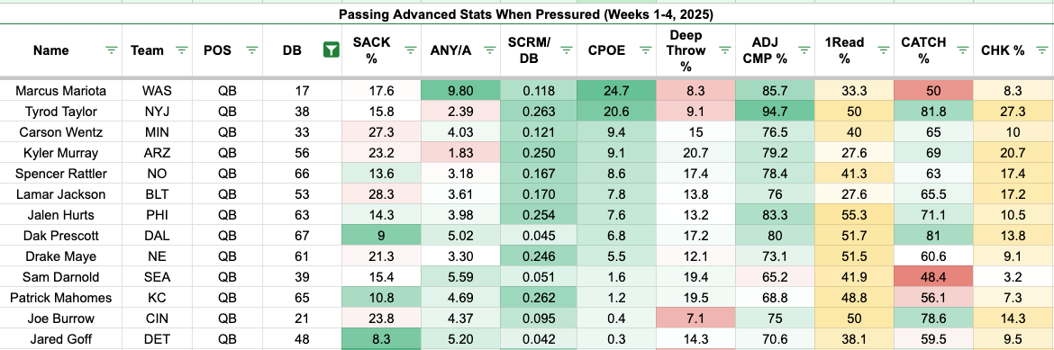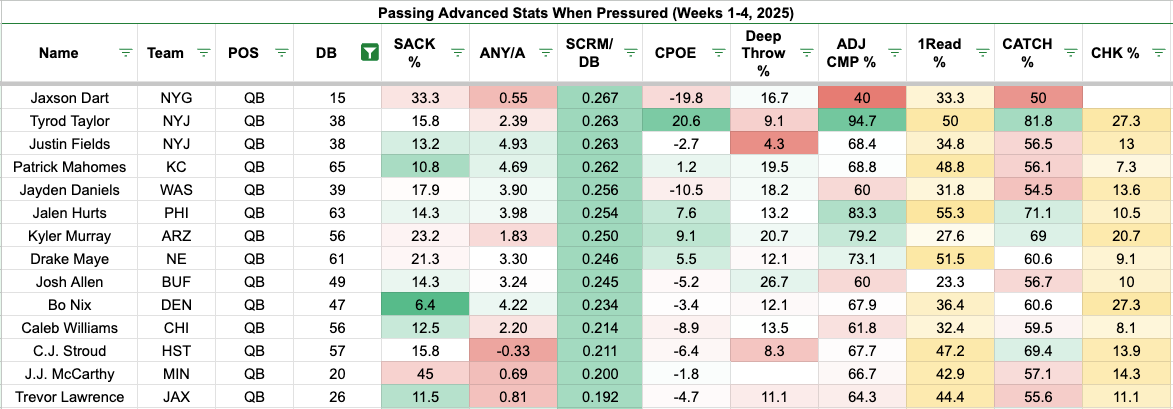 The Jets’ offensive line allows the highest pressure rate (55.1%) while facing a Cowboys’ defense that pressures the quarterback at the 10th highest percentage. Tyrod Taylor was more efficient as a passer, but Justin Fields ranked 20th in CPOE, 12th in catchable target rate, and fourth-highest pressure-to-sack rate against pressure.