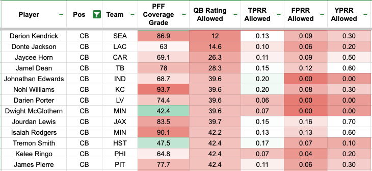The Seahawks will be without Devon Witherspoon, but Derion Kendrick has been sneaky good in the slot. Kendrick leads the team in PFF Coverage Grade and allows the lowest passer rating among all cornerbacks with 10 coverage snaps and one target.