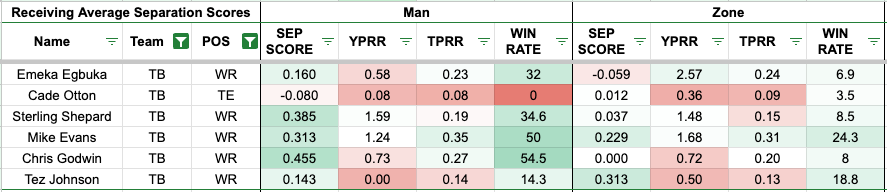 When we filter by slot coverage snaps only, Kendrick allows the lowest passer rating and the lowest yards per coverage snap in the slot among all cornerbacks and safeties with 10 or more coverage snaps. That’s notable for Sterling Shepard, who ran the highest percentage of his routes out of the slot (42.9%) among the primary options. However, the Buccaneers deployed Chris Godwin (34.9%) and Emeka Egbuka (34.1%) similarly in the slot and out wide.